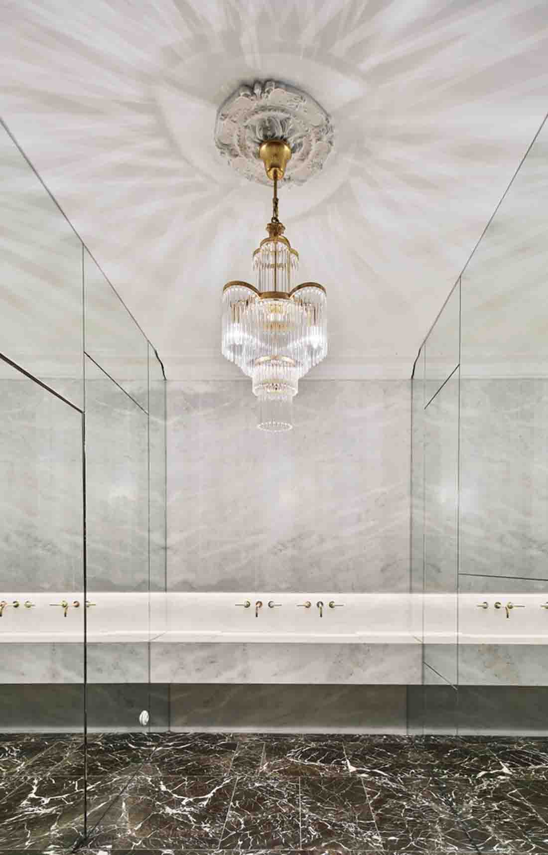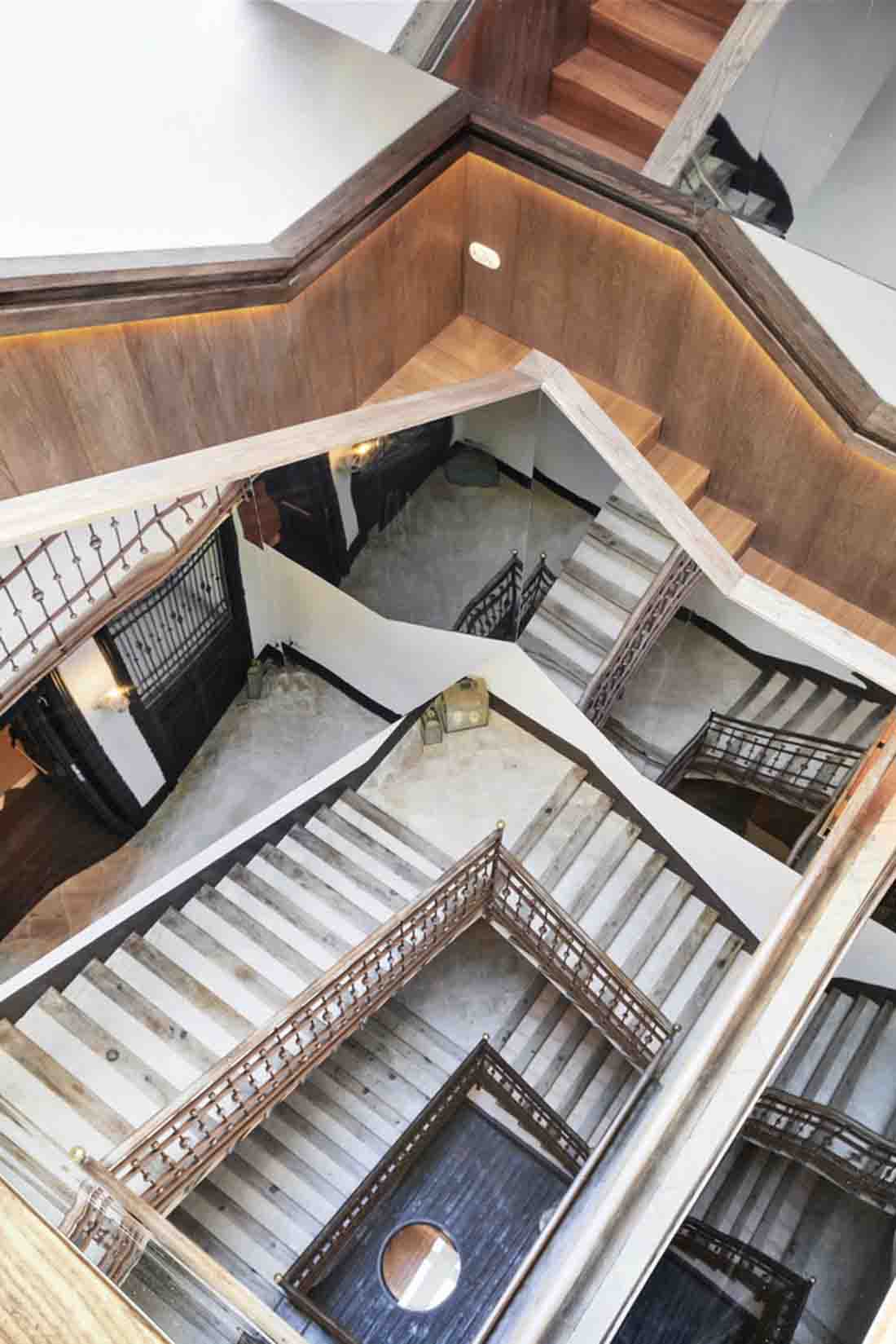 在主樓梯中,天窗被水淹沒(méi),變成了一個(gè)帶有透明底部的小水池,在水中形成了光的活動(dòng),使樓梯上充滿了反射。