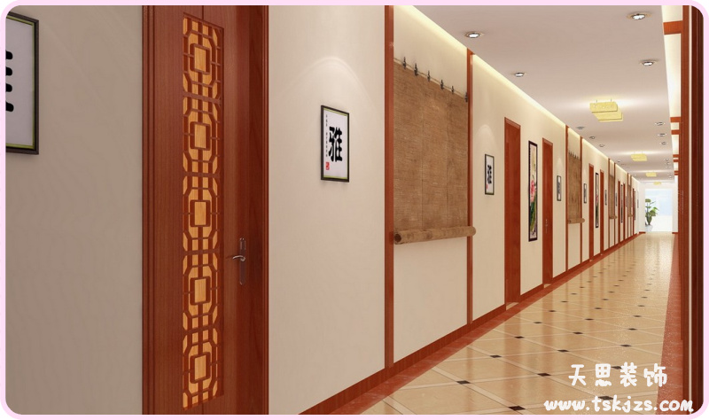 走廊是室內(nèi)流通空間的主要部分,其空間特點是狹長,且缺少變化,人在這種空間中容易產(chǎn)生單調(diào)感。因此,在設(shè)計上應(yīng)做一定的藝術(shù)處理。使其既不能過于華麗、復(fù)雜,也不宜過于簡單、呆板、應(yīng)在墻壁上做一定的裝飾點綴。如做出口線、偏倚柱、外門套和墻壁裝飾線條的藝術(shù)處理,以及字畫或燈光的點綴。在特殊功能區(qū)的路段,可以做色彩變化或不同的裝飾處理,從而形成 統(tǒng)一中有變化的視覺效果。在通常情況下,走廊的設(shè)計要求是:應(yīng)有充足的光照度、統(tǒng)一和諧的界面裝飾,清新淡雅的色調(diào)和明確的導向指示。