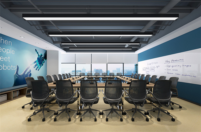 2、該辦公室裝修項目主要是使用者作為科技類產(chǎn)品的研發(fā)空間,要求足夠?qū)挸?,空間的開放度與靈活度自由變換,辦公桌實現(xiàn)可隨意拼裝組合。設(shè)計師在設(shè)計上立足于;靈活共享的主線,以設(shè)計、現(xiàn)代、開放和連通為主題,著眼于科技發(fā)展的今天和未來,創(chuàng)造出一個極富時代感和超前性的辦公空間。整個辦公空間以白色為基底色,輔以藍色的協(xié)調(diào)、中和,黑、  白、藍成為標(biāo)準(zhǔn)層的主色系,完美將辦公層的空間格局進行分割,營造出現(xiàn)代簡約、自由開放的高端科技感。長方形燈具應(yīng)用突出了現(xiàn)代科技的嚴(yán)謹(jǐn)態(tài)度,極大凸顯企業(yè)的文化感與產(chǎn)品前沿的設(shè)計感。會議室根據(jù)實際需求,實際軟裝時則以多彩元素為主題,一眼望去 ,布滿了明快的顏色 ,活潑卻不繁雜 ,采用的半透明亞克力玻璃椅是點睛之筆,帶給空間無限的靈動感。黑板漆墻面設(shè)計則豐富了使用者的功能需求,達到裝飾和功能并存的目的。靈活的辦公桌還可自由變換,滿足不同需求的會議要求。