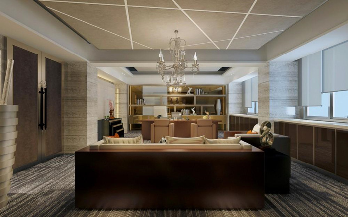 3、有質(zhì)感的辦公室設(shè)計:設(shè)計師通過簡化前臺裝飾元素來凸顯簡介的企業(yè)標(biāo)識,讓綠植承載的環(huán)保元素更加醒目,同時也強調(diào)了企業(yè)的科技感。在設(shè)計前方接待區(qū)的時候,充分運用了自然色+燈光的組合來強化企業(yè)內(nèi)涵體驗。沙發(fā)、地毯、茶幾與落地?zé)粼陂_放的空間里構(gòu)建了一個心理上私密的會客區(qū)域,具有濃濃的現(xiàn)代科技?xì)庀?。將空間劃分為辦公區(qū)域、交流區(qū)域、展示區(qū)域,在設(shè)計師看來總經(jīng)理辦公室相當(dāng)于一個小型的迷你辦公室,既要具備多重功能,又要做到空間內(nèi)部的辦公與配套系統(tǒng)的完整與契合。通過地毯、精選的辦公桌椅,并且結(jié)合不同區(qū)域燈光的變化讓辦公空間具有層次感。