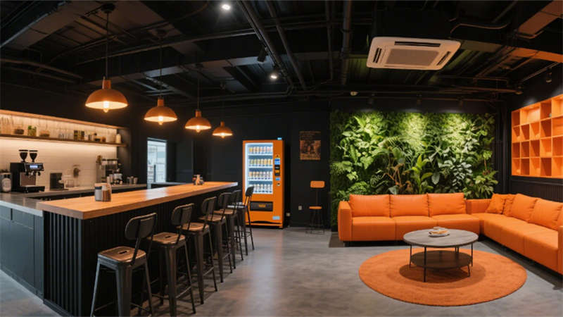 人性化細(xì)節(jié)貫穿各區(qū)域:電梯廳導(dǎo)向系統(tǒng)與隱藏式消防設(shè)施實現(xiàn)功能隱形化,員工休息區(qū)混搭工業(yè)風(fēng)吧臺與暖光沙發(fā),搭配咖啡機(jī)與綠植墻釋放壓力。設(shè)計同步植入環(huán)保理念,采用低能耗照明系統(tǒng)、空氣監(jiān)測模塊及可回收建材,構(gòu)建健康可持續(xù)的辦公生態(tài),傳遞企業(yè)面向未來的品牌價值觀。