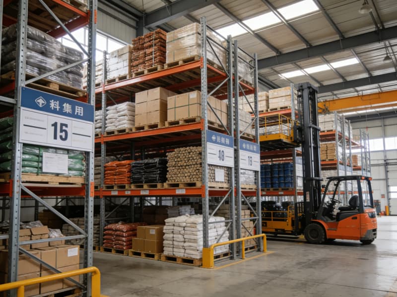 原料存儲區(qū)運用多層式的金屬貨架,將空間進(jìn)行了充分的垂直利用,不同類型的原料分區(qū)存放,標(biāo)識清晰,便于管理和取用。同時,配備了先進(jìn)的搬運設(shè)備,提高了貨物的搬運效率。