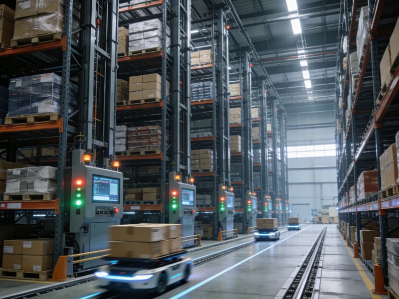 倉(cāng)儲(chǔ)區(qū)運(yùn)用自動(dòng)化的立體貨架,通過(guò)物聯(lián)網(wǎng)系統(tǒng)實(shí)現(xiàn)精準(zhǔn)庫(kù)存管理。智能運(yùn)輸小車在劃定的軌道上穿梭,高效完成貨物搬運(yùn)。