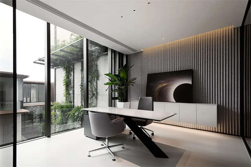 建筑是凝固的音樂,音樂是流動的建筑。二、三層分別是開敞式辦公和高管辦公區(qū),空間整體黑白分明、線條硬朗,像是鋼琴的黑白鍵,揮灑自如,動人的旋律,或悠揚(yáng)或激昂。