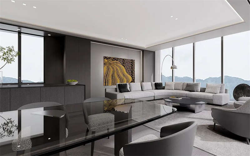 接待區(qū)以沙發(fā)組和會議室實(shí)現(xiàn)休息、接待、和會議功能。沙發(fā)地毯圍合成舒適的功能區(qū),落地?zé)?、藝術(shù)裝置讓這里更有會客廳的親切感,灰色與白色的搭配經(jīng)典時(shí)尚。