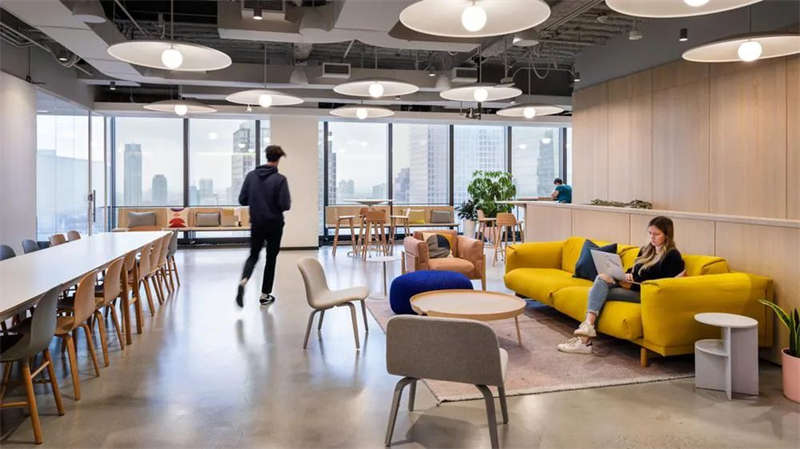 超大的開放式工作區(qū),其間穿插點綴著各式協(xié)作空間——從會議室到電話亭應(yīng)有盡有。兩個樓層都在建筑西側(cè)規(guī)劃了大而開敞的公共區(qū)域,這里享有廣闊的城市景觀視野和充足的日光,并通過一座木制樓梯上下緊密連接。