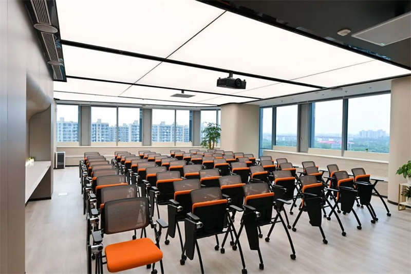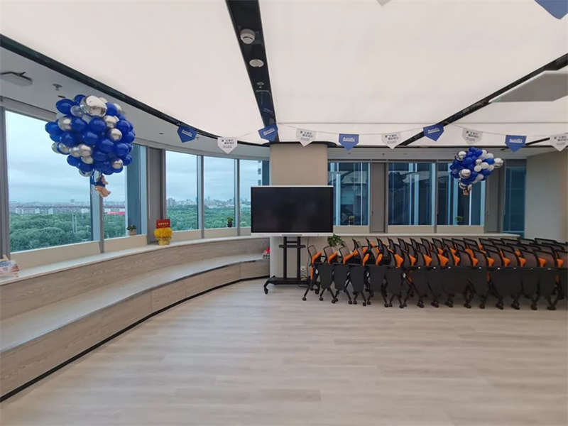 設計團隊特意選擇了一處大型開敞的臨窗場地,在酷炫的3D裸眼展示室旁邊打造出了一個4S店風格的培訓和茶水的二合一空間,以滿足客戶快速發(fā)展的團隊培訓和新品發(fā)布的需求。在臨幕墻的位置,設計師原來就設計了一排沿窗的休閑階梯造型臺階,后來因為疫情防控的需求,把臺階內的空間利用好,平時內部可以儲藏睡袋,防疫物資,帳篷等物品。