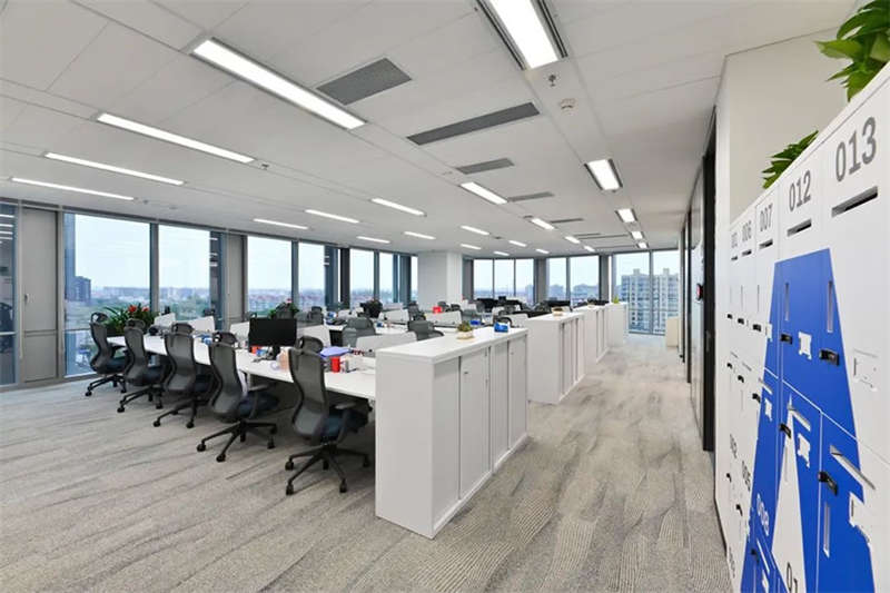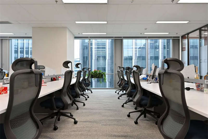 員工區(qū)部份選用了電動可調的升降辦公桌,以滿足員工個性化的需求,白灰色的家具搭配,混搭淺木色的休閑洽談區(qū)域,地面選用流線款長版的無膠水鋪裝的地毯相呼應。提升了空間品質和美感。