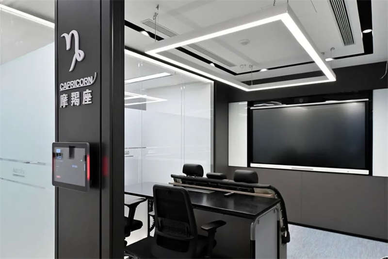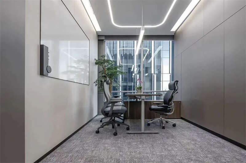 在接待前廳左右兩邊各設置了一個大會議室,其中一個是現(xiàn)代酷灰的可二合一的會議室,另一個是穩(wěn)重優(yōu)雅的行政會議室。感謝成品隔斷供應商卡萊斯卓的緊密配合和支持,在設計師的要求下,把LED燈帶嵌入了雙層玻璃隔斷中。讓整個會議室區(qū)域看上去充滿科技感!