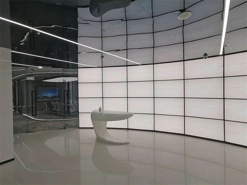 在電梯出來,一步入半圓弧的接待前廳,馬上看到的是以安全氣囊元素為主創(chuàng)意的,帶燈光變化的半弧造型墻,時尚大氣。在這純粹的黑白灰空間里,一個純白色飛馳動感造型的前臺安安靜靜的擺設在那,在不使用的時候,它也是一個時尚的藝術品。和背鏡墻相結合,體現(xiàn)了速度與安全的設計理念。
