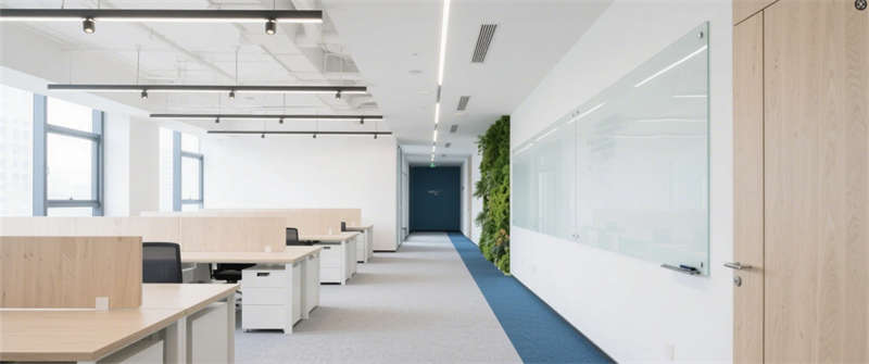 開放式辦公區(qū):北歐風(fēng)工位搭配綠植墻,裸露天花軌道射燈兼顧實(shí)用與工業(yè)美感;