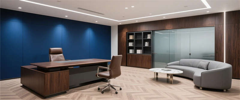 總裁辦公室:人字拼木地板與深胡桃木家具提升質(zhì)感,深藍(lán)藝術(shù)漆背景墻強(qiáng)化品牌識別;