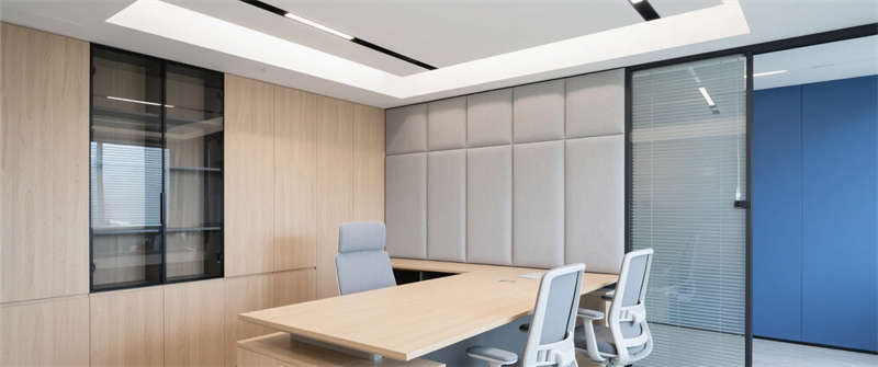 智能會(huì)議室:深藍(lán)色吸音墻面呼應(yīng)企業(yè)VI色,智能屏幕與玻璃隔斷凸顯科技屬性;