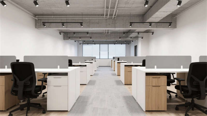 步入空間,現(xiàn)代簡約工業(yè)風(fēng)以原始肌理與智能元素碰撞出獨(dú)特韻律。淺灰水泥與原木的基調(diào)貫穿始終,裸露結(jié)構(gòu)構(gòu)件與暖光線性照明形成張力,綠植垂直裝置在冷峻材質(zhì)中注入自然呼吸感。開放式辦公區(qū)模塊化桌椅靈活組合,落地窗引入天光,軌道射燈精準(zhǔn)聚焦高效場景;獨(dú)立辦公室的磨砂玻璃隔斷兼顧隱私與通透,深胡桃木桌面沉淀商務(wù)氣質(zhì)。