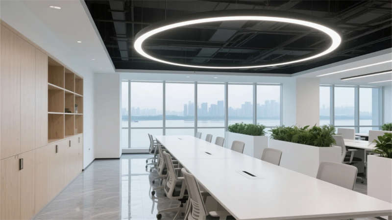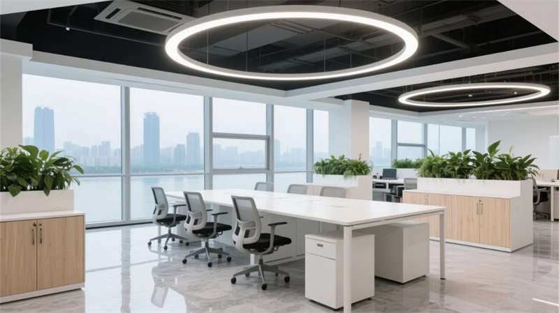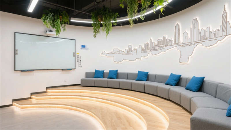 開放辦公區(qū)以模塊化綠植隔斷柔化邊界,智能會議艙曲面屏動態(tài)呈現(xiàn)江岸線,賦予協(xié)作以在地詩意。創(chuàng)意實驗室的可書寫玻璃墻與磁吸家具激發(fā)即興創(chuàng)造,而階梯沙龍區(qū)弧形燈帶如江水蜿蜒,引導思想交匯。