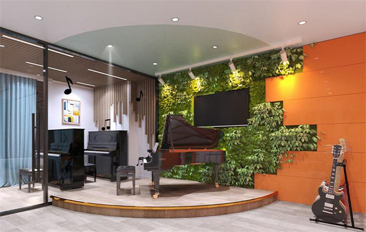 前廳不變的情況下,logo背景墻色調(diào)偏重,所以運(yùn)用了色彩降噪,添加了一些偏冷色調(diào),不僅能夠提升整個(gè)空間的舒適感,還能給孩子一個(gè)安全、放松的空間。結(jié)合了logo的主色調(diào),再進(jìn)行色彩搭配可以形成歡快、親切、活潑的色彩氛圍。與此同時(shí)還設(shè)置了也增加了兩間鋼琴室,提高了空間利用率。大廳玻璃教室內(nèi)墻面貼了吸音板,一方面體現(xiàn)機(jī)構(gòu)在音樂(lè)上的專業(yè)性,另一方面就是讓空間的隔音效果做到最佳,讓孩子在學(xué)習(xí)的時(shí)候不受干擾,能夠安靜的學(xué)習(xí)。