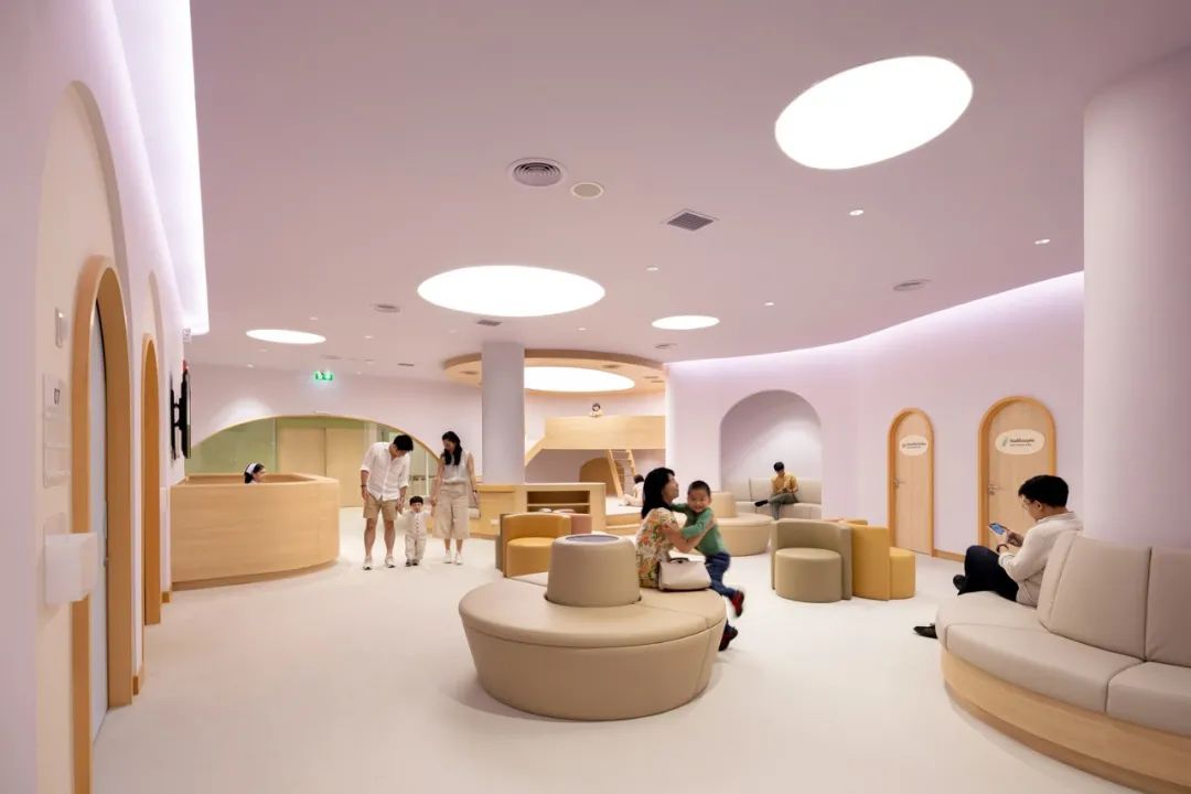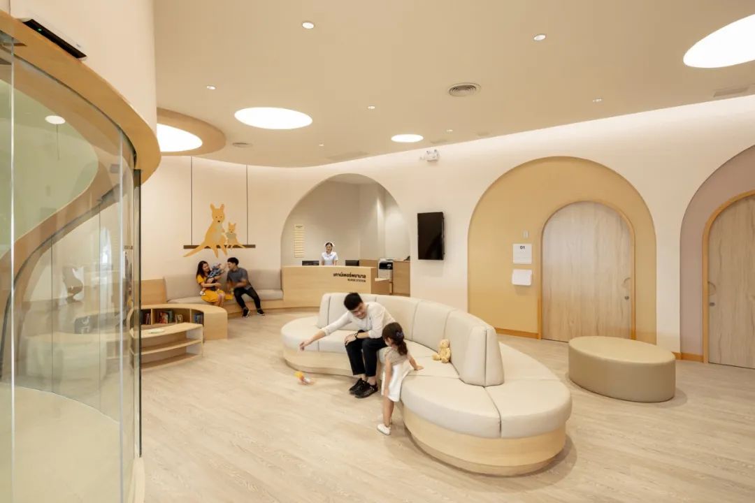 對于生病的孩子來說,富有趣味的內(nèi)飾才是關(guān)鍵,拱形門框讓看病成為一場趣味探險,消除了孩子與醫(yī)生間的隔閡。醫(yī)院的一樓和二樓都有兒童游戲區(qū)域,原本對于家長和孩子來說十分難熬的候診時間,便可以在這里悠閑的度過。當然醫(yī)院內(nèi)也有專門的等候空間,不同于以往醫(yī)院中冷冰冰的不銹鋼座椅,柔軟的觸感、彎曲的造型都十分人性化。