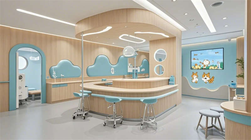 門診大廳以8米挑高空間構(gòu)建醫(yī)療門戶形象,曲面導(dǎo)診臺與智能分診系統(tǒng)形成高效服務(wù)樞紐,木紋格柵吊頂與綠植景觀墻弱化傳統(tǒng)醫(yī)院的冰冷感。兒科診區(qū)創(chuàng)新運用馬卡龍色系與云朵軟包墻面,互動投影游戲區(qū)搭配動物主題診療設(shè)備,構(gòu)建兒童友好型醫(yī)療環(huán)境。VIP病房采用全景落地窗與智能護(hù)理系統(tǒng),可變形家具滿足陪護(hù)與康復(fù)雙重需求,展現(xiàn)高端醫(yī)療的溫度感。