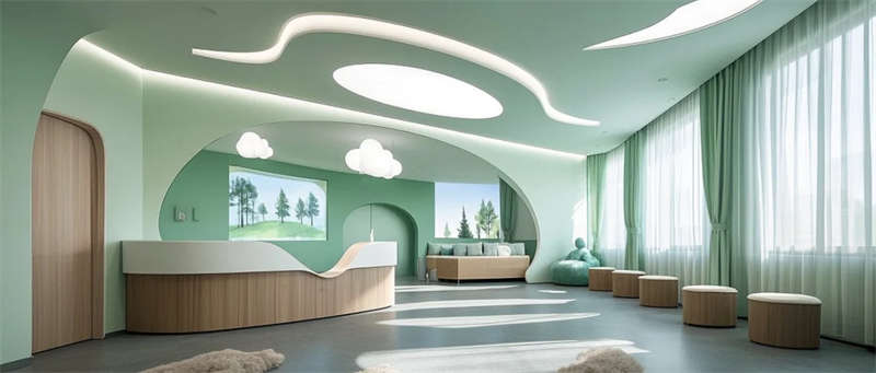 這個醫(yī)療空間以自然療愈為語言重塑傳統(tǒng)醫(yī)院體驗。建筑內(nèi)部流動的淺木與灰綠色系,搭配原生綠植景觀墻,模糊了室內(nèi)外邊界,讓自然光與綠意成為治愈媒介。門診走廊的弧形墻面消解機構(gòu)冰冷感,兒童診區(qū)的森林投影與云朵軟包,用敘事化設(shè)計緩解診療焦慮。