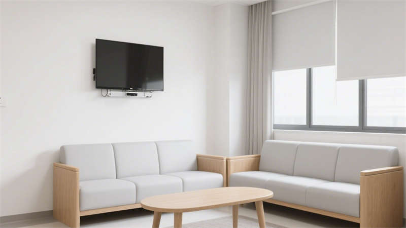 居住房間內(nèi),家具選擇圓角設(shè)計,減少意外碰撞帶來的傷害;床頭設(shè)置緊急呼叫按鈕,方便老人在需要時快速尋求幫助,按鈕位置高度適中,便于老人伸手觸碰。室內(nèi)采光充足,搭配柔和的照明系統(tǒng),避免強光刺激老人眼睛,同時保證夜間行走時的光線亮度。色彩搭配以溫暖柔和的色調(diào)為主,營造溫馨舒適的居住氛圍,幫助老人緩解焦慮情緒,更快適應(yīng)養(yǎng)老院的生活環(huán)境。整體設(shè)計在滿足適老化功能需求的同時,兼顧現(xiàn)代風(fēng)格的美觀與實用性,為老人提供一個安全、舒適、溫馨的居住空間。