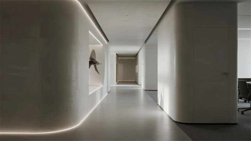 本設(shè)計(jì)以現(xiàn)代簡約語言重構(gòu)辦公展示空間,摒棄冗余裝飾,用微水泥的質(zhì)樸肌理與金屬的精致光澤形成對(duì)話。線性光帶貫穿空間,勾勒出清晰的建筑輪廓,同時(shí)營造輕盈的科技感。大量留白處理賦予空間呼吸感,使產(chǎn)品展示與人文辦公自然融合。玻璃隔斷的應(yīng)用模糊了功能區(qū)域的邊界,形成通透連續(xù)的視覺體驗(yàn)。精心調(diào)配的自然光照與人工照明系統(tǒng),在不同時(shí)段呈現(xiàn)細(xì)膩的光影層次。軟裝選用低飽和度色調(diào),搭配溫潤木元素與綠植,平衡科技空間的冷靜感,最終打造出一個(gè)既體現(xiàn)專業(yè)氣質(zhì)又蘊(yùn)含人文溫度的現(xiàn)代辦公展廳。